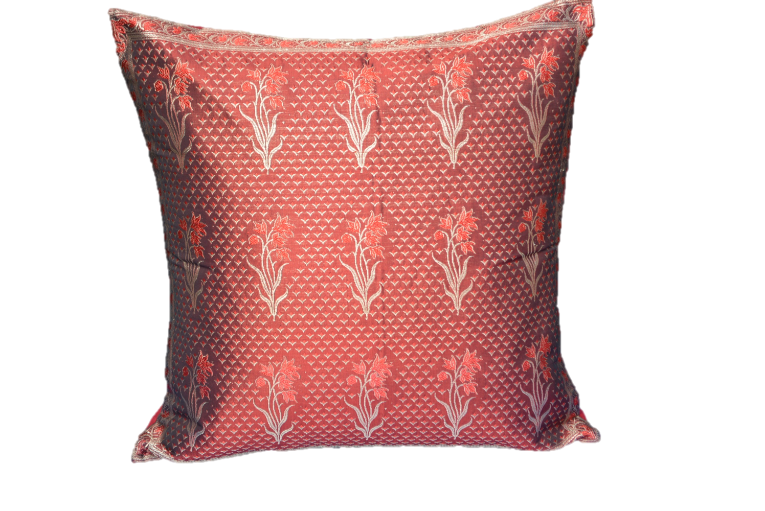 Truly royal and one-of-kind handmade pillow cover, perfect for adding a splash of color and unique style to any room or decor. Beautifully crafted piece with Indian Ethnic designs weaved in cloth to create a timeless piece. The Pillow cover has a silk handwoven design with floral patterns in front and a solid color in the back with Zipper closure behind. The back of the pillow cover is made with satin silk fabric, with a flap covered hidden zipper for a clean look and easy removal. . Colors look different in different light settings.