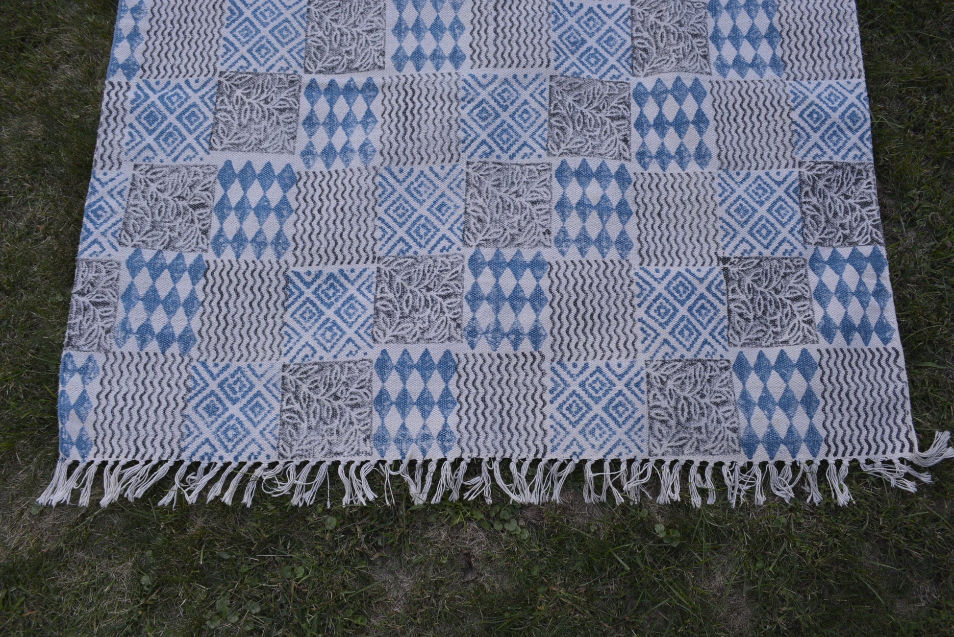 INDIGO DYED HANDWOVEN BLOCK PRINTED COTTON RUG WITH FLORAL PRINT –